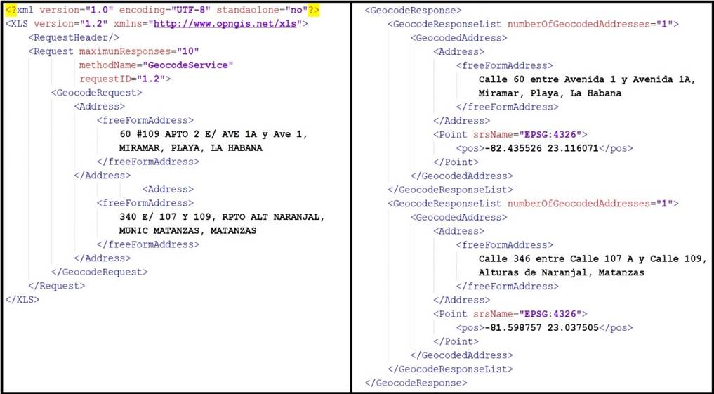 La geocodificación de direcciones, según el estándar OpenLS, se puede realizar en lotes de más de una dirección. Una petición que sigue el estándar OpenLS y que contiene más de una dirección a geocodificar se muestra en la Figura 2 (izquierda).
