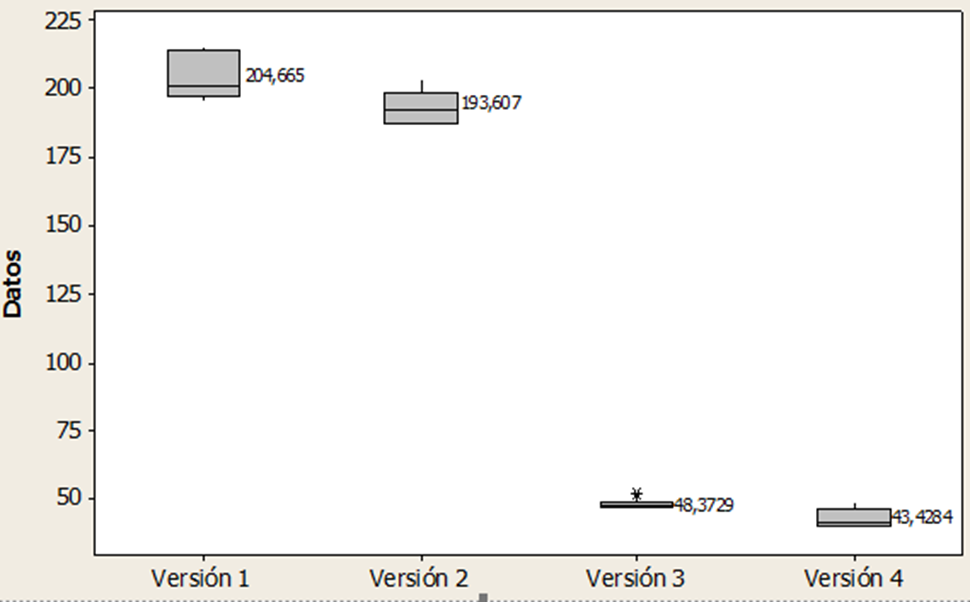 De forma similar se utilizó la prueba de hipótesis de Mann-Whitney para realizar comparaciones entre la versión 1 y las versiones 3 y 4 del sistema y en todos los casos se obtuvo un valor p menor que αajustada por lo que todas las versiones nuevas del sistema disminuyen los tiempos de ejecución del sistema de geocodificación de direcciones postales.