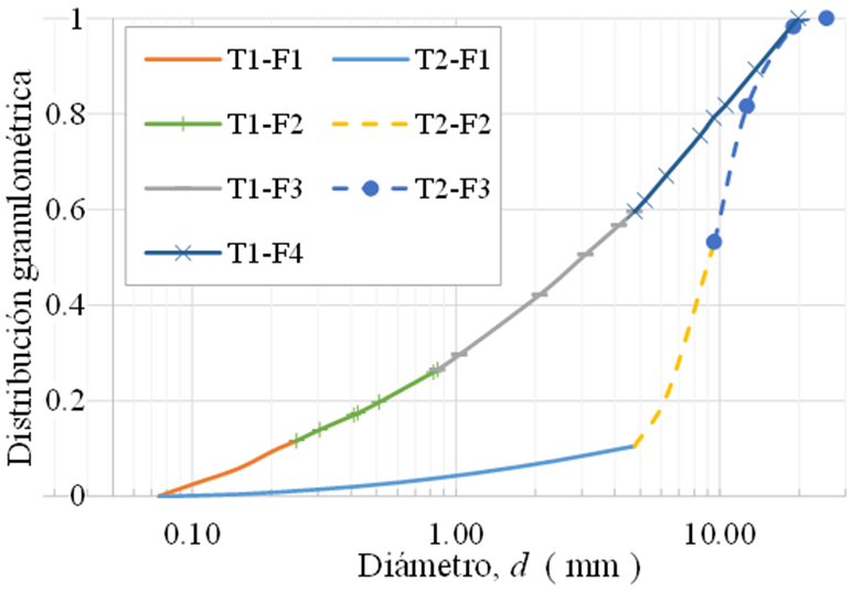 El tezontle disponible en los bancos de préstamo de la Ciudad de México, puede presentar granulometrías muy variadas, desde bien graduadas con coeficiente de uniformidad Cu=23 (T1 en la Figura 1) hasta mal graduadas con Cu=2 (T2 en la Figura 1). El material T1-F3 de la Figura 1 es una fracción granulométrica del tezontle bien graduado, de interés en el siguiente apartado de este trabajo.