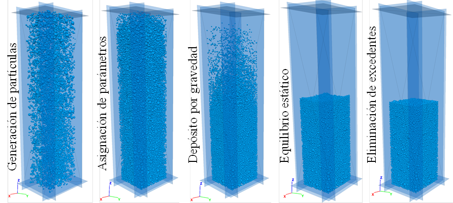 La formación de la muestra granular consiste en escoger los diámetros de las partículas de acuerdo con la granulometría conocida (Auvinet, 1986), las partículas se generan en posiciones aleatorias dentro de un espacio en forma de paralelepípedo, se asignan los parámetros de la simulación y se dejan caer las partículas por gravedad hasta alcanzar el equilibrio. La Figura 6 ejemplifica este procedimiento.