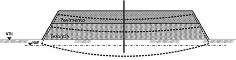Un terraplén típico está constituido por el cuerpo principal del terraplén y por los materiales superficiales que constituyen el pavimento (Figura 8). Los materiales del pavimento (base y carpeta asfáltica) tienen requisitos estrictos de resistencia y deformabilidad que no permiten el empleo de materiales de alta porosidad. Por lo contrario, el cuerpo del terraplén puede construirse con materiales ligeros como el tezontle para evitar asentamientos excesivos.