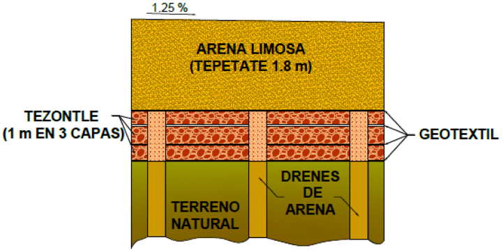 La Figura 9 muestra la configuración de las capas de tezontle adoptada para un terraplén de prueba con drenes de arena para aceleración del proceso de consolidación (Auvinet, 2016).