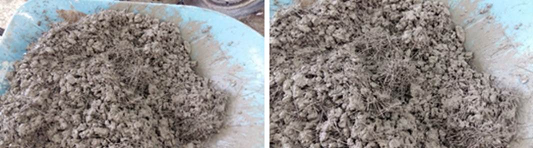La fibra de sintético ondulada con porcentajes de 1.00 % y 1.50 % formó aglomeraciones o “bolas” de fibras en la mezcla de concreto (Figura 5), resultando en una distribución no homogénea; sin embargo, esto fue posible mitigarlo con una mezcla más fluida y mayor contenido de finos.
