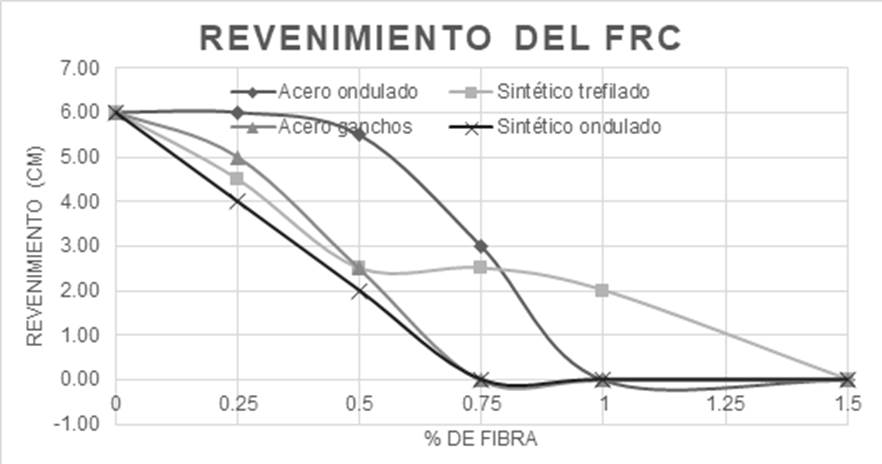Aunque la fibra de acero ondulado presenta una geometría similar a la del sintético, la primera no ocasionó una reducción del revenimiento tan drástico debido a que la longitud de la fibra es de menor tamaño y las ondulaciones son menos pronunciadas, lo que ocasiona sea fácil deslizar una fibra con otra. Asimismo, con las fibras de acero con gancho en los extremos se obtuvieron reducciones significativas.