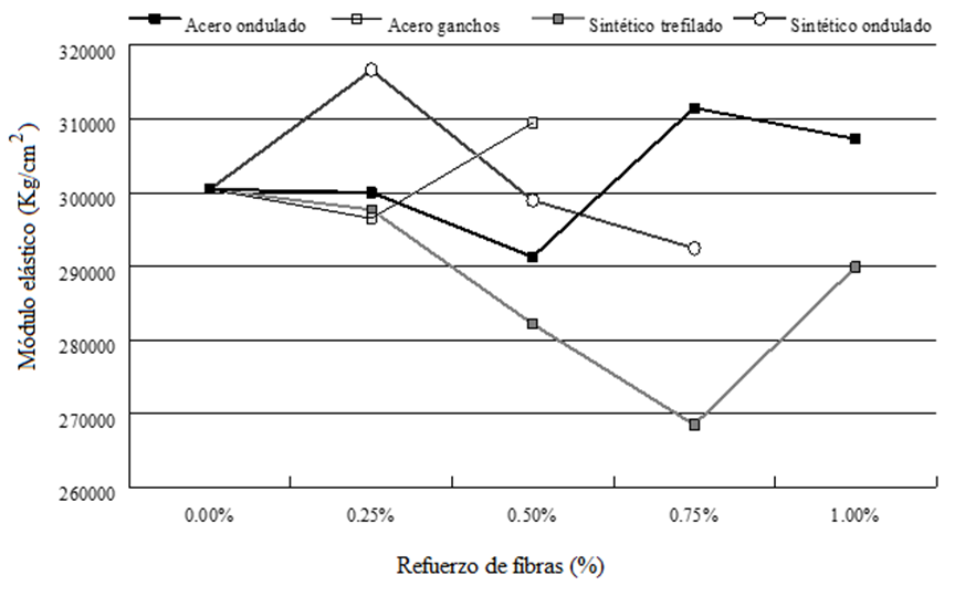 Por otro lado, el resultado del módulo elástico de la mezcla de concreto base sin fibras presentó un valor E = 29,466 MPa. En la Figura 8 se muestran los efectos de cuatro tipos de fibras, estos oscilaron en 3 % del módulo elástico de un concreto sin refuerzo; en particular, las muestras con sintético trefilado presentaron una reducción mayor al resto de 10.65 %, al contrario de los reforzados con sintéticos ondulados que aumentaron hasta 5.39 %.