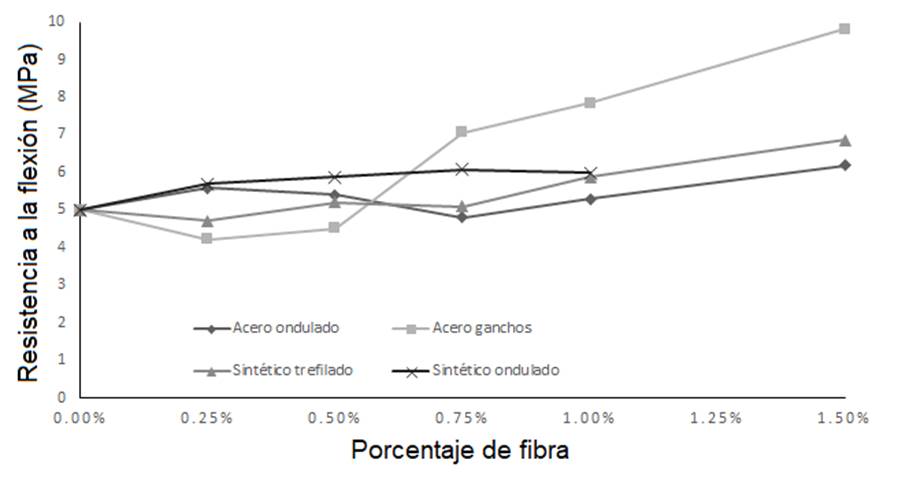 De acuerdo con Zollo (1997), el porcentaje de fibra, respecto al volumen de la mezcla de concreto, puede variar de 0.1 a 1 %, los cuales son porcentajes bajos, 1 a 3 % siendo moderados, y 3 a 12 %, los cuales serían porcentajes altos. Sin embargo, en la literatura se han reportado valores desde 0.25 a 2.0 %, como se muestra en la Tabla 1. Los resultados resumidos en la Tabla 1 demuestran que las fibras de poliéster y de carbón son las de mejor desempeño, mientras que las fibras de celulosa y PET (polietileno tereftalato) disminuyeron el MR (Módulo de ruptura) 9.56 % y 18.85 %, respectivamente.