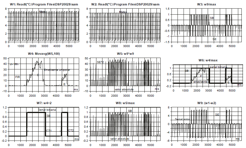 Los ciclos de trabajo, cuyo tiempo de asincronía normalizada es de 1.50 [s] a 3.08 [s], para el mayor, y de 4.45 [s] a 4.96 [s], para el menor, se presentan en la ventana W7 de la Figura 6. Finalmente, la ventana W6 muestra, tanto el ciclo de trabajo de la SB como la función envolvente E, en forma traslapada.