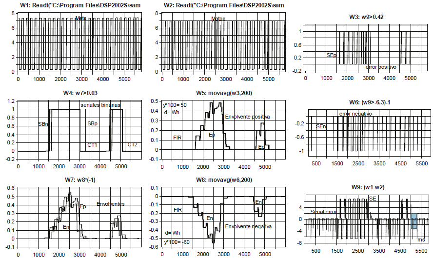 Para conocer los instantes en que aparecen las diferencias en fase o asincronías, y cuánto duran, así como también en qué momento surgen las máximas y sus magnitudes, se necesita aumentar el volumen de la SE, i.e., se calcula su valor absoluto, como se muestra en la ventana W5, para después obtener la función envolvente E [Wh], tratando de que sea lo más completa posible por medio de un filtraje paso bajas tipo FIR promediador como se indica en (1) y en la ventana W4 (v.g., por medio de la función movavg (W5, FS)), y el cual debe utilizar un factor de suavizado FS elegido del intervalo de operación 2 < = FS < Fm / Fs para estos filtros promediadores; donde la frecuencia de muestreo (Fm) y la de corte de la señal (Fs) corresponden a 500 Hz y a 0.5 Hz, respectivamente. Para el caso, se selecciona un FS positivo de 100, el cual equivale a un filtraje pasa bajas de orden mediano. Con la idea de comparar sus volúmenes o densidades en forma normalizada, se presenta la señal de error o de asincronía y su señal de valor absoluto en las ventanas W3 y W8, respectivamente.