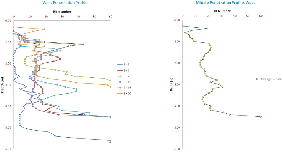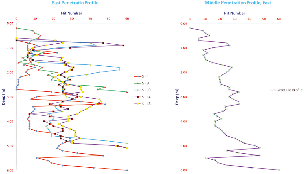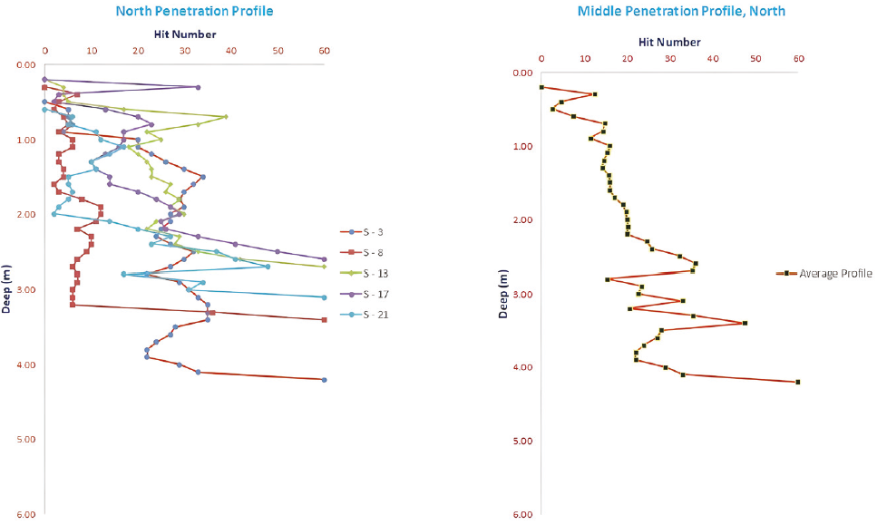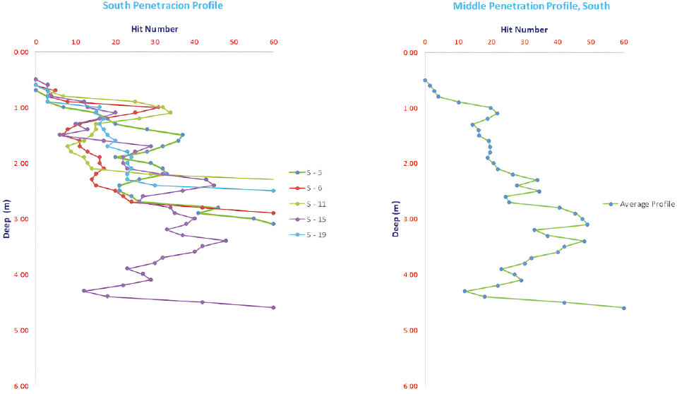 Figure 11 presents the exploration of the south end with probes S-5, S-6, S-11, S-15, and S-19, here it can be observed that the soil presents low RP from the surface up to a depth of 0.90 m, and the soil is competent at 4.60 m deep.