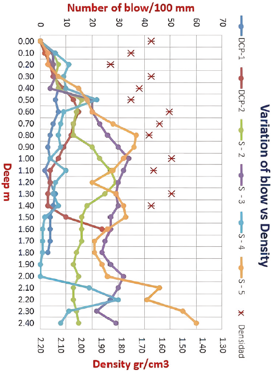 On the other hand, the PDC test is affected by the fines present, the moisture content, the granulometry and the vertical pressure acting on the column of the penetrometer bars (Deepika & Chakravarthi, 2012). Now it presents a comparison of the results obtained in this work, with those presented by (Abdulrahman et al., 2015), during the verification of soil densification and its homogeneity, of a property industrial of Saudi Arabia, obtained by means of the nuclear densimeter and the resistance to penetration obtained by means of the Manual Dynamic Penetrometer, respectively. These results were compared with the results of the S-2, S-3, S-4, and S-5 probes, developed in the community of Los Angeles, where it was possible to corroborate that the results of the Manual Dynamic Penetrometer were useful in the exploration of the subsoil and the identification of its homogeneity, as it was necessary to determine it, in the case study of the void formed at the intersection of the aforementioned streets (Figure 12).