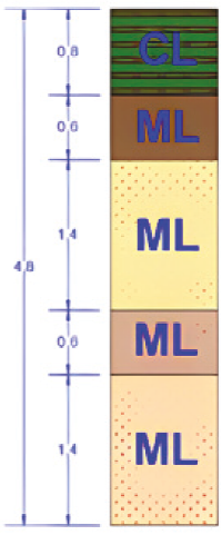 The soil profile showed five strata at the site of interest; the first stratum goes from the surface to 0.80 m underground and it is a CL-type soil (Low plasticity inorganic clay), the second stratum goes from 0.80 m to 1.40 m underground and it is an ML-type soil (Low compressibility inorganic silt), the third stratum goes from 1.40 m to 2.80 m underground and it is an ML-type soil (Low compressibility inorganic silt), the fourth stratum goes from 2.80 m to 3.40 m underground and it is an ML-type soil (Low compressibility inorganic silt), and the fifth stratum goes from 3.40 m to 4.80 m and is an ML-type soil (low compressibility inorganic silt).