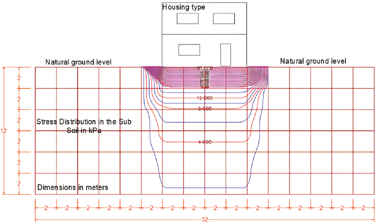 Figure 20: Stress distribution in the subsoil under loads of a platform supporting the structure of a 2-story house. The curves are the isobars obtained with the nodes or stress interpolation points