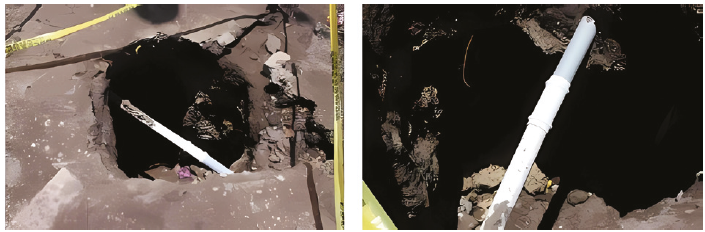 A truncated conical cavity was located with 0.80 m in diameter on the surface, 2.00 m in diameter at the bottom, and 2.80 m in depth. Inside it showed several ducts of up to 40 cm in diameter, partially obstructed with residues of the collapsed vault; in addition, the soil adjacent to the cavity showed low resistance due to saturation. It was also possible to identify the presence of subway conduits branching in different directions. The main conduit is directed towards the northeast. All of the above confirms the hypothesis that we are in the presence of a sinkhole.