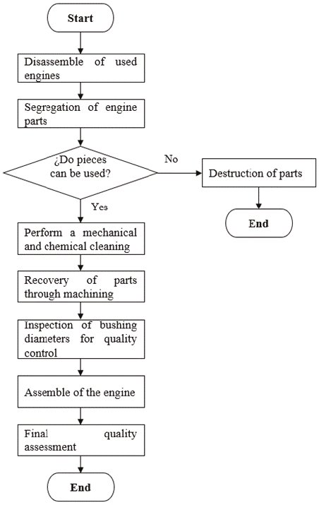 The engine remanufacturing process under study begins with the disassembly of used engines. Then, the cores are segregated by visual inspection; those parts suitable for remanufacturing are separated for further processing, and those that are fractured or worn out are destroyed and placed in special containers for disposal to avoid black-market trading. The following process consists of cleaning recovered parts where the pieces are mechanically and chemically washed by submerging the elements in a hot bath using different solvents. Afterward, the parts of the engine are recovered by machining them to ensure compliance with quality standards. At this point, the diameter of components, like bushings and bush housings, is measured with a bore probe, with ten-thousandths of an inch accuracy. The following steps are the engine assembly and the final inspection where, through several tests, the core is verified to fulfill the power curve. The process is exemplified in the following flow diagram (Figure 1).
