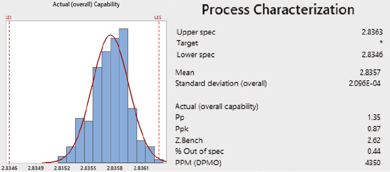 The capacity analysis of the diameter of the bushing in seven bushing engines shows a capable process in the long term within the specification limits (Ppk = 0.87). It also shows the process has 4,350 defects per million opportunities (Figure 3). Nonetheless, the capacity can be improved to guarantee that data is within limits and close to the specification mean objective.