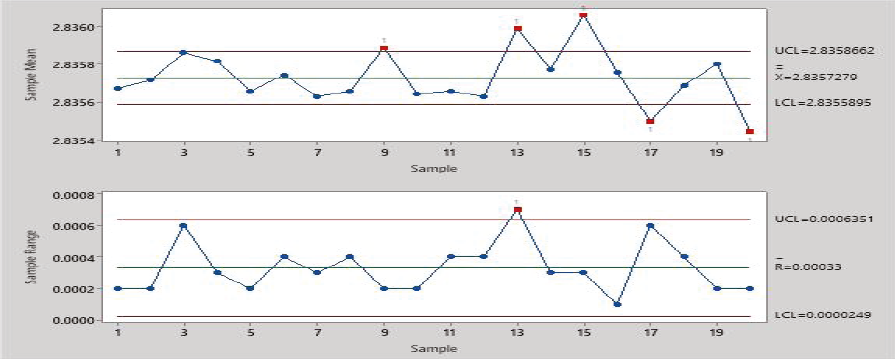 After the proposal implementation, new data was gathered, revealing the following results: The chart shows the mean and the control limits of the process for the diameter of seven bushings. The number of subgroups used was 20. According to the results, the process is not stable, since 25 % of the data which translates to 5 subgroups, is out of control. The process mean equals 2.835727 inches. As a result, subgroup means still tend to fall between the central limit and the upper limit of the specification in both charts (x̅ and R charts) shown in Figure 4.