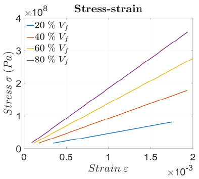 The theoretical material was studied analytically by means of MATLAB®, in which it was modeled with different percentages of fiber to understand and select the most suitable for the purpose: 20, 40, 60, and 80 percentage of fiber were tested. All models were assumed to be in a configuration of 0°, considering that all fibers would be parallel to the applied force. In Figure 1, the mechanical behavior of each percentage is presented.