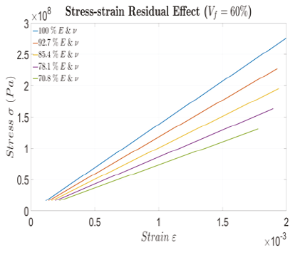 It was submitted the composite material to a standardized tension test following ASTM D3039 (International, A., 2017), this test was analytically done, and it was obtained the maximum capacity load to withstand below the elastic limit, the maximum strain and stress. To focus on a reusable material, it was established that the process of charge-discharge should be done more than one time, consequently, residual stress is assumed to affect the stiffness of the material: