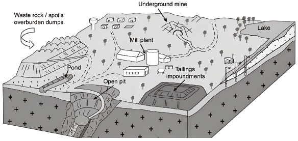 Surface storage, such as landfills (waste rock) and reservoirs (tailings, slag).