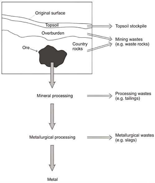 Solid mining wastes are heterogeneous geological materials that may consist of sedimentary, metamorphic or igneous rocks, or loose soils and sediments. As a result, particle sizes vary from clay size to rock fragments. The wastes generated during mining operations are acid mine drainage (AMD), mine waste rock, tailings, heap leach tailings, placer or washings, cyanidation process wastes, metallurgical wastes (slag) and radioactive wastes.
