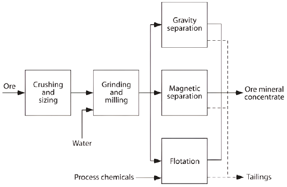 Figure 3 shows schematically the stages of mineral processing. At each stage, waste is generated that must be disposed of properly. The wastes generated during each stage take different names either by their size, physical and chemical composition, water content or by the process used during their production.