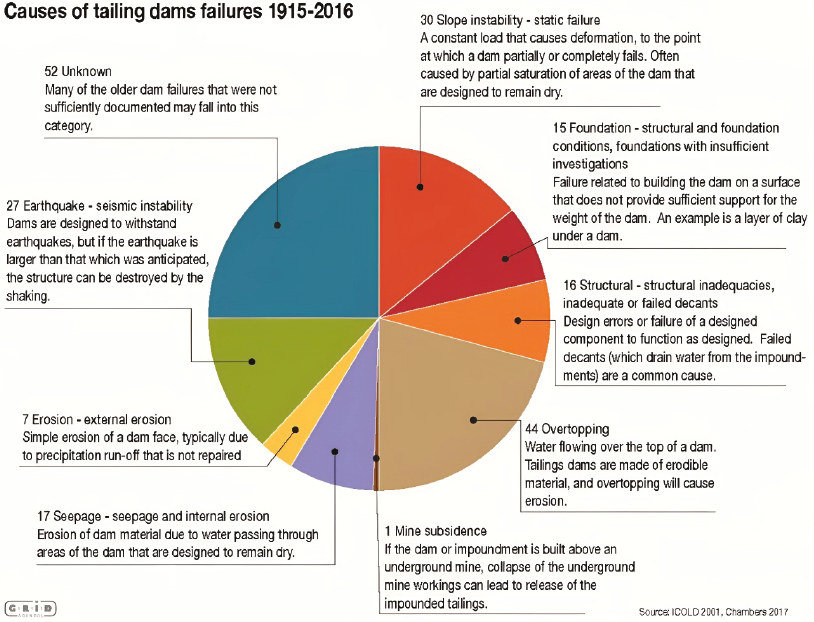Many mining waste storage failures have occurred in the world. Inadequate designs, poor construction, operation or closure practices are the main causes of the poor performance of the deposits. Reports from various international organizations were analyzed to assess the causes of recorded accidents. The main ones being inefficient design, and inadequate monitoring and maintenance during the construction, operation, or closure of the deposit (Williams, 2018). Figure 5 presents a graph of mining deposit failures. The most frequent causes of failure include overflow, seismic activity, and slope instability. Failures due to unknown causes show poor registration, investigation, or concealment of information by operators.