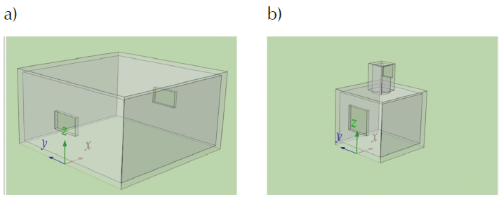 Building geometries for both configurations are shown in Figure 1. In the CV configuration, the building has an internal area of 4.20 m×4.20 m and an internal height of 2.10 m, with two opposite windows of 0.90 m×0.45 m. The building roof is flat. This geometry was taken from (Kurabuchi et al., 2004). In the UCV configuration, the building has an internal area of 3.0 m×3.0 m and an internal height of 2.7 m. The window is square with a side length of 1.30 m, it is horizontally centered on the wall and its base is at 0.90 m from the floor. The WE is at the center of the building roof, it has a square cross-section duct with an internal side length of 0.65 m, and an internal height of 1.40 m when measured from the rooftop. The WE has a single square opening area equal to that of the WE duct cross-section. The building and the WE roof are flat. This building geometry was taken from the C0LW case of (Castillo et al., 2017).