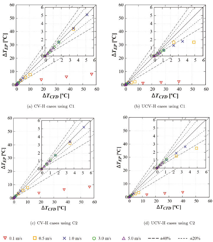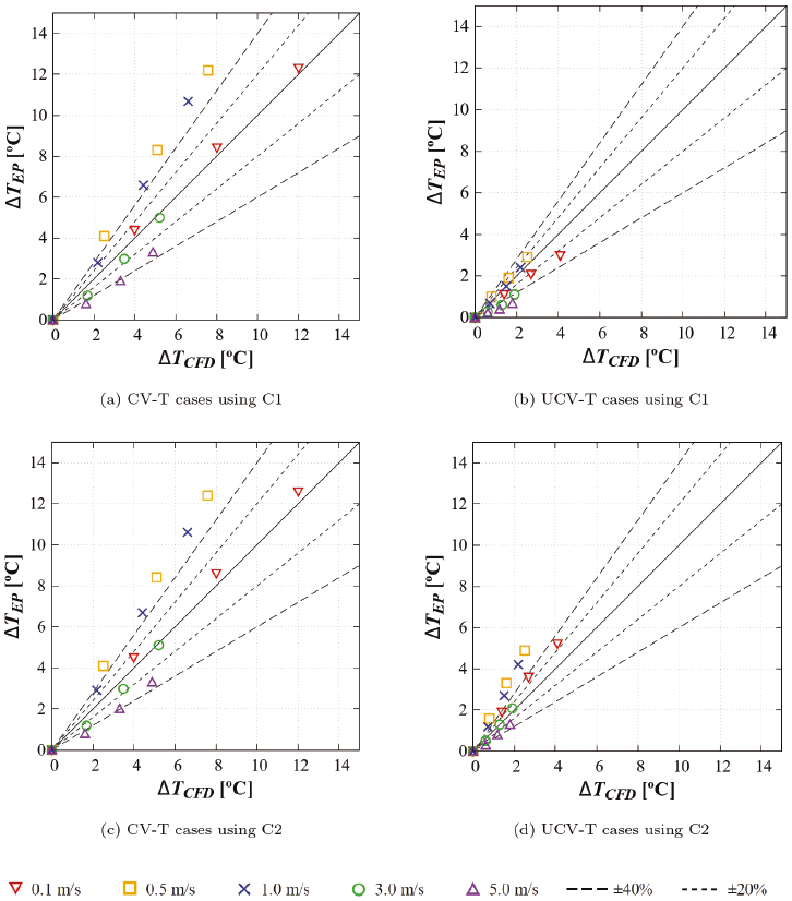 For CV-T cases, shown in Figure 11, EP reproduces the CFD value of ∆T for v10 = 0.1 m/s with a difference of less than 9 % and 11 %, and for v10 = 3.0 m/s with a difference of less than 29 % and 28 %, for the other values of v10 the difference is up to 62 % and 64 %. For UCV-T cases, the difference between EP and CFD ∆T results for v10 = 0.1 m/s is less than 10 % and 40 %, and for v10 = 3.0 m/s is less than 45 % and 20 %. For the other values of v10 the difference is up to 64 % and 100 %. For CV-T cases the difference between C1 and C2 results is not significant, while for the UCV-T cases the difference is significant.