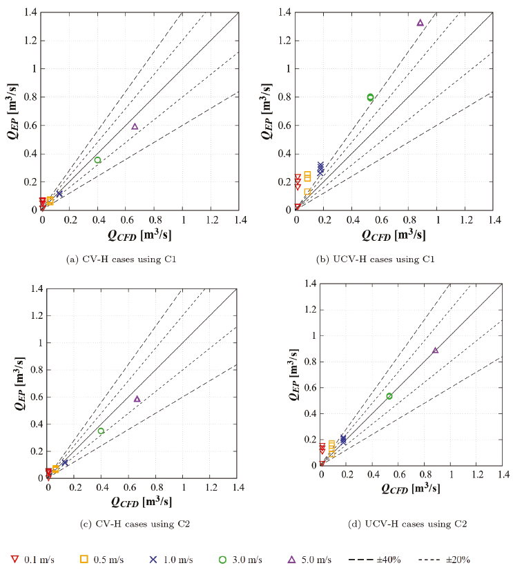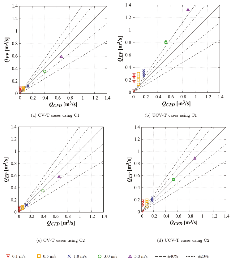 Figure 13 shows Q results for CV-T cases. EP reproduces the CFD value of Q for v10 ≥ 1.0 m/s with a difference of less than 13 % and 14 %, for v10 = 0.5 m/s the difference is up to 40 % and 35 %, for v10 = 0.1 m/s the difference is up to 601 % and 569 %. For the UCV-T cases, the difference between EP and CFD Q results for v10 ≥ 3.0 m/s is less than 52 % and 2 %, for v10 = 1.0 m/s is up to 99 % and 34 %, for v10 = 0.5 m/s is up to 234 % and 121 %, and for v10 = 0.1 m/s is up to 1,515 % and 944 %. For the CV configuration, as in the H cases, the results using C1 and C2 are similar, while for the UCV configuration, the results improve significantly when C2 is used, especially for v10 ≥ 1.0 m/s.