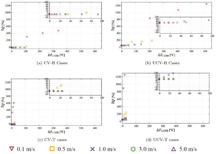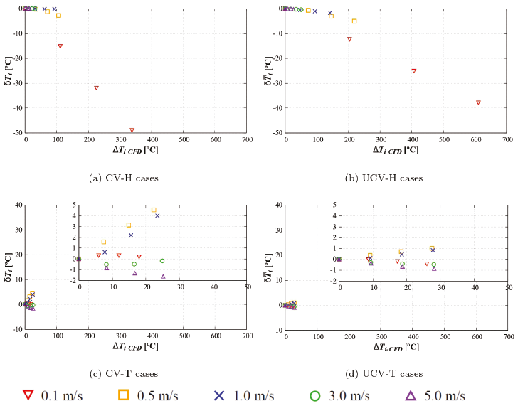 For CV-H cases (Figure 10) EP reproduces the CFD value of ∆T for v10 ≥ 1.0 m/s with a difference of less than 5 % and 4 %, for v10 = 0.5 m/s the difference is of less than 26 % and 24 %, but for v10 = 0.1 m/s the difference is of up to 86 % and 85 %.