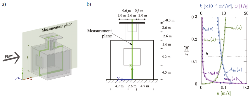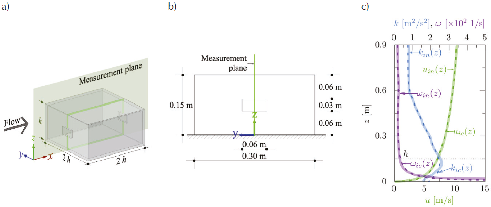 Figure 4 Wind driven upward cross ventilation case for validation: a) scaled model isometric view with measurement plane, b) scale model front view with dimensions, and c) vertical profiles of the fluid velocity, u; turbulent kinetic energy, k, and the specific dissipation rate, ω, at the inlet (solid line) and at the incident position (dashed line) in the empty domain. The subscripts in and ic refer to inlet and incident, respectively