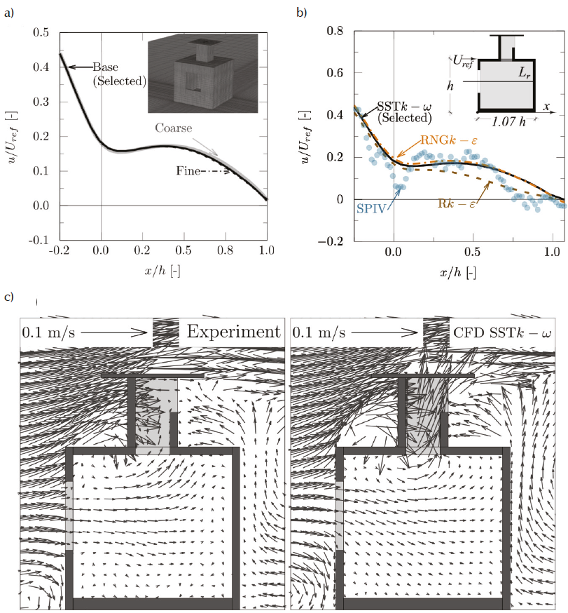 Experimental results of a wind driven UCV case (Figure 4a, b) obtained using an open water channel (OWC) and stereoscopic particle image velocimetry (SPIV) (Cruz-Salas et al., 2014) are used for the CFD validation. The validation was performed following the methodology in (Castillo et al., 2019), because the UCV case is similar to the case validated in that work.