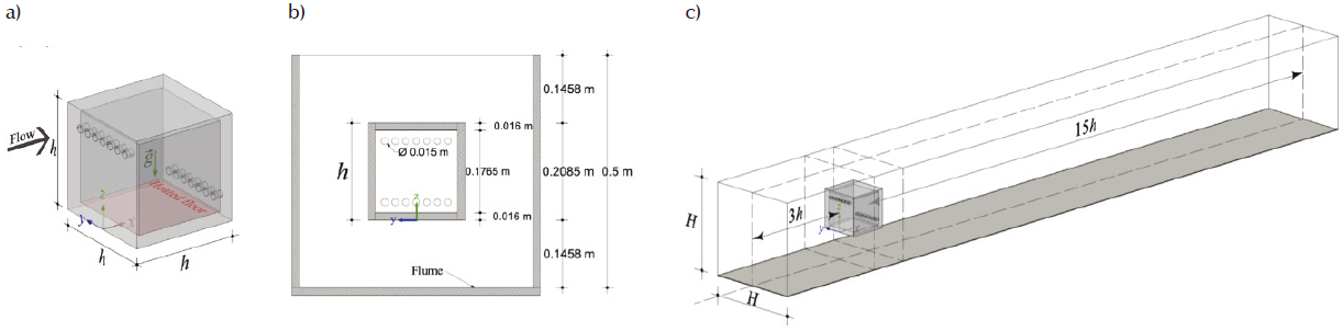 Figure 6 Scaled model of a building with circular top openings at its windward facade and bottom openings at its leeward facade: a) right isometric view, b) front view with dimensions and c) isometric view of the computational domain with dimensions. h = 0.2085 m is the characteristic length