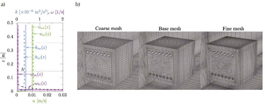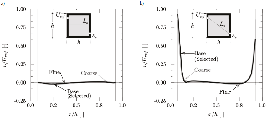 For the CFD simulations, the physical properties of the fluid are obtained from (Lishman & Woods, 2006). The Boussinesq approximation is used. In the convergence criteria the scaled residuals for energy are equal to 10−7. The computational domain is constructed to reproduce the flume test section (Figure 6c). This domain also has a deviation from the guidelines (Franke et al., 2007; Tominaga et al., 2008). Three grids with hexahedral cells are generated (Figure 7a): the coarse grid has 270,079 cells; the base grid has 576,628 cells and the fine grid has 1,074,406 cells. Constant values of u and the turbulence intensity are set at the domain inlet (0.01 m/s and 0.1, respectively). Free slip condition (Gallardo et al., 2013) is set at the domain top. The lateral walls of the domain are specified as smooth no slip walls. q is applied as a constant heat flux on the building floor. In Figure 7a the streamwise gradients of the u, k and ω profiles are presented. Their values are smaller than 6 %.