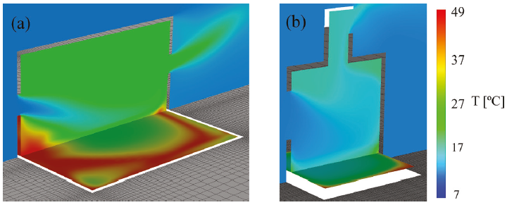 Figure 9 Temperature contour plots at the vertical central plane and on the floor, for T cases with v10 = 0.01 m/s and floor temperature of 45°C, a) cross ventilation and b) upward cross ventilation configurations