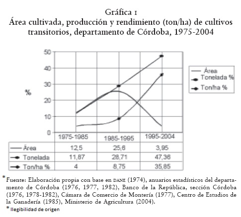 En lo que concierne al sector de la agricultura, se debe advertir que el departamento de Córdoba es de vocación esencialmente agropecuaria, la economía se sustenta en los cultivos transitorios de pancoger (yuca, ñame, plátano, arroz, ajonjolí y maíz), aunque también en los de algodón, maíz y arroz con fines comerciales. Así evolucionó hasta el año 1975, cuando se introdujo el sorgo como un cultivo promisorio, cubriendo inicialmente un área de 21,892 hectáreas hasta llegar a un total de área cultivada de 125,664 ha. Luego, en 1985, aparece el coco (3,700 ha) y un poco de cacao (0.65 ha), para un total en ese mismo año de 141,400 hectáreas.