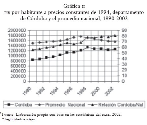 Sin pretender establecer una relación de causalidad entre el comportamiento de la producción agrícola antes anotado y los ingresos y empleos en el ámbito departamental, sino como un simple dato de referencia, se encuentra que, de acuerdo con las cifras del Departamento Nacional de Estadísticas (DANE, 2002), gráfica II, el PIB por habitante a precios constantes de 1994 del departamento de Córdoba durante el periodo 1990-2002, presenta una tendencia creciente y una variación anual superior al promedio nacional, pasando de 55.8% en 1990 a 68.1% en 1995 y 80.9% en 2002, con una tasa anual de crecimiento de 1.33% frente a 0.93% del país, es decir, entre 1990 y 1995, 1.14% y 1.04%; en 1996-2002, 1.09% para Córdoba y 0.96% el nacional.