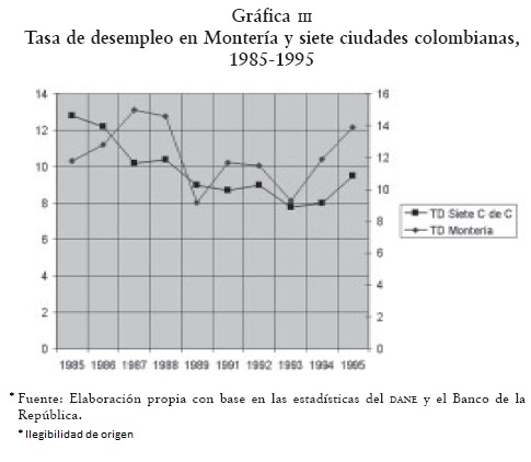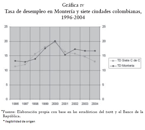Sin embargo, si se analizan los datos del DANE (gráfica III), se observa que el desempleo en Montería, la capital del departamento, en el periodo 1985-1995 tuvo un comportamiento ascendente, excepto 1989 y 1993, con una tasa media anual de crecimiento de 12.17%, inmensamente superior a la registrada para siete ciudades colombianas (9.76%). En 1996-2004 se incrementó a 16% frente a 15.1% del promedio registrado para las mismas ciudades, con el agravante de que mientras en éstas se registra una leve tendencia decreciente a partir de 2000, en Montería sucede lo contrario (gráfica IV).
