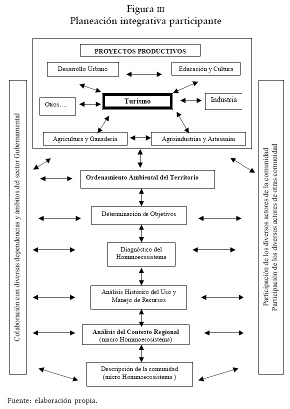 Como resultado del estudio e interpretación de las categorías de análisis se propone como categoría de aplicación la planeación integrativa participante (figura III). En esta categoría se hace énfasis en la necesidad de integrar los diferentes sectores de la actividad económica al plan de desarrollo sostenible, así como a las diversas dependencias y ámbitos (federal, estatal, municipal y local) del sector gubernamental, para que a partir de un modelo de ordenamiento ambiental del territorio se propongan los programas sectoriales que se complementen, en lugar de contraponerse a los principios de sostenibilidad o a los otros sectores; asimismo, de manera paralela se fundamenta en la participación de los múltiples actores de la comunidad objeto de estudio y de las comunidades aledañas, todo ello considerado en el contexto regional.