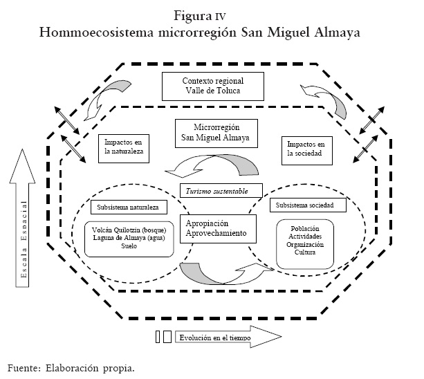 Finalmente, con la intención de concretar las ideas expuestas y no dejar las propuestas en el nivel teórico, en la figura IV se representa a la comunidad de San Miguel Almaya como un hommoecosistema, esto es, un sistema complejo abierto, resultado de la interacción recíproca entre los subsistemas natural y sociocultural en una dinámica dialéctica inseparable, integrada e interrelacionada, en este caso una microrregión que forma parte de un sistema mayor, el Valle de Toluca (región) con sus componentes: los subsistemas natural y sociocultural. Se destacan los procesos fundamentales de cada uno de los subsistemas para explicar la problemática ambiental a partir de las relaciones entre ellos, derivados de la apropiación y aprovechamiento de los recursos naturales y los efectos que generan las actividades sobre los recursos y condiciones naturales, así como los impactos que éstos tienen en la sociedad, todo ello con la finalidad de analizar las posibilidades para desarrollar proyectos turísticos sostenibles.