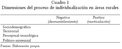Un análisis de los procesos de surgimiento del individualismo en las sociedades rurales y, a su vez, la limitación de este marco teórico en los espacios rurales, lleva implícita la consideración de diversas dimensiones, entre las que se consideran cuatro: sociodemográfica, territorial, perceptualtecnológica y políticoasistencial. En cada una se presentan los procesos de individualización de forma diferenciada. Se ha considerado que el principal proceso es el socialperceptual, pero cada uno puede aparecer con mayor o menor intensidad en distintos espacios. La forma de presentación, la intensidad y su conjugación propician distintos procesos de individualización, desde muy débiles hasta otros de notable intensidad. Por último, es necesario apuntar que no sólo se consideró la dimensión social de la individualización, en el entendido de que también tiene claras implicaciones territoriales y políticas.