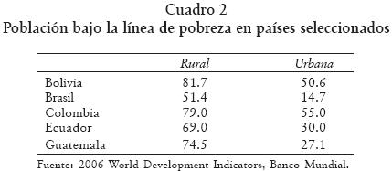 En todo caso, se podría plantear si estos procesos de transformación social, ligados a determinadas clases sociales en áreas rurales, pueden constituir un argumento válido tanto en el ámbito global como en el microanálisis. En zonas donde los procesos de transformación de las áreas rurales han quedado ligados al debate sobre la propiedad de la tierra y a cuestiones de tipo étnico, los procesos de cambio social y movilidad espacial pueden quedar confinados a áreas rurales y supeditados a la existencia de determinados niveles de bienestar material. La existencia de una gran proporción de habitantes que viven en la pobreza constituye un freno para los procesos de individualización, al no existir una base material que permita a la persona efectivamente tomar las decisiones adecuadas en relación con su biografía (cuadro 2). Por otra parte, la pobreza rural suele estar más extendida que la urbana. El propio tamaño de la pobreza rural actúa como limitante tanto para la autonomía como para el bienestar material (Beck et al., 1997).