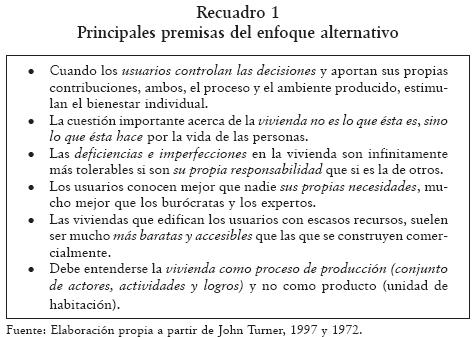 Sin embargo, y como enfoques no convencionales destinados a atender a los sectores de extrema pobreza, han coexistido y sobrevivido otras concepciones para atender el problema del hábitat popular a las que se ha identificado como alternativas (o no convencionales) y estructuralista, cuyos orígenes se remontan a las décadas de los sesenta y setenta.