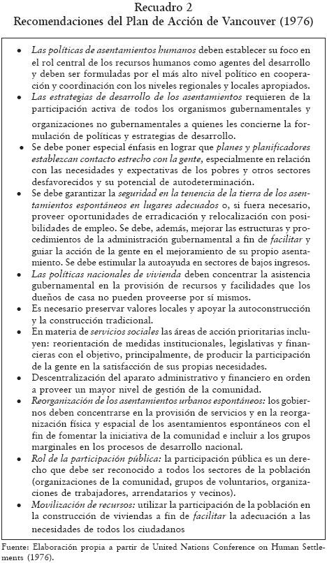 Las recomendaciones de la primera Conferencia Mundial sobre los Asentamientos Humanos Hábitat I, realizada en Vancouver en 1976, dejan ver la influencia de su pensamiento.13 De acuerdo con la Declaración de Vancouver, "[...] los esfuerzos deben estar dirigidos, en particular, a promover acciones que motiven a la población a decidir y actuar por sí misma con el apoyo apropiado del gobierno y [...] a descentralizar las instituciones a fin de facilitar [las cursivas son nuestras] a las comunidades locales la identificación de sus propias necesidades y campos de acción" (United Nations Conference on Human Settlements, 1976: 37).