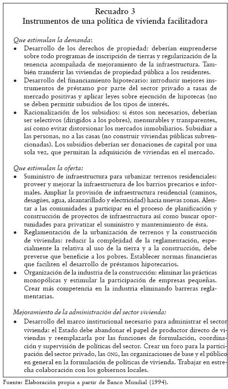 De este modo, el Banco Mundial (recuadro 3) promovió entre los gobiernos la adopción de este enfoque con el fin de canalizar la asistencia financiera, exhortándolos a que cumplieran una función de facilitación, dejando de lado la construcción, el financiamiento y el mantenimiento de viviendas y alentándolos a que se ocuparan de mejorar la eficiencia del mercado inmobiliario y las condiciones de vivienda de los pobres (Banco Mundial, 1994).