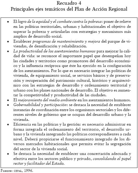 Este enfoque se puede identificar como la última etapa del periodo dominado por el enfoque facilitador y se encuentra vinculado fundamentalmente a acuerdos y consensos de dos reuniones internacionales y sus declaraciones respectivas: el Plan de Acción Regional (recuadro 4), aprobado en la Reunión Regional de América Latina y el Caribe Preparatoria de la Conferencia de las Naciones Unidas sobre Asentamientos Humanos (Hábitat II), realizada en Santiago de Chile en 1995, y el Programa Hábitat II, acordado en Estambul, Turquía, en 1996. Dicho enfoque supone, en lo sustantivo, superar la perspectiva sectorialista que ha caracterizado a todas las formas de intervención en los problemas sociales y se funda en la necesidad de lograr enfoques más integrales de política social.