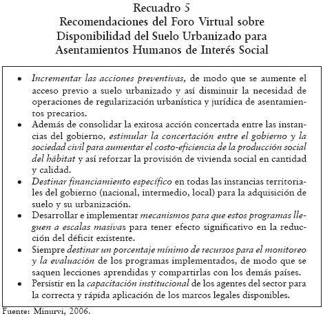 Treinta años después de Hábitat I, la necesidad de convertir ideas en acciones se instala como desafío fundamental. La reciente Asamblea de Ministros y Autoridades Máximas del Sector de la Vivienda y el Urbanismo de América Latina y el Caribe (Montevideo, octubre de 2006)21 centró sus discusiones en el tema de la disponibilidad de suelo urbanizado para asentamientos de interés social y acordaron las siguientes recomendaciones: