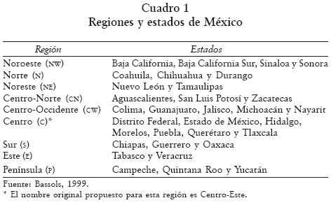 1) Aunque en México existen regionalizaciones administrativas y nodales, se prefirió trabajar con una región de tipo homogéneogeográfica, pues este tipo de regionalización se sustenta en aspectos metodológicos rigurosos desde el punto de vista de la ciencia regional y, sobre todo, permite efectuar comparaciones y análisis de los diversos espacios en que puede dividirse el territorio. Con base en este criterio se delimitaron las regiones del país (conjuntos de estados) que analizamos (cuadro 1).