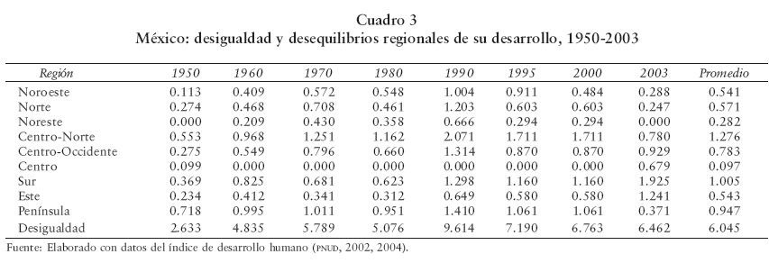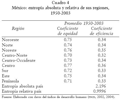 Durante el periodo 19502003, el desarrollo y la entropía regional mostraron en México el siguiente comportamiento. En el ámbito específicamente regional, las áreas gradualmente evolucionaron hacia mejores niveles de equidad y eficiencia, pero en particular para el año 2003 la mayor eficiencia, por encima del promedio nacional, la habían alcanzado las regiones Noreste (83%), Noroeste (81%), Norte (81%) y la Península (81%). Mientras que las regiones Centro (79%), CentroNorte (78%), CentroOccidente (77%), Este (76%) y Sur (72%) no superaban el promedio nacional de eficiencia (79%). Con respecto a la equidad ideal, las regiones mejor ubicadas en el contexto nacional por tener distancias a la equidad por abajo del promedio nacional (1.24 distancias), eran el Noreste (1.00), Norte (1.08), Noroeste (1.10), Península (1.12) y Centro (1.23). Por encima del promedio nacional se encontraban las regiones CentroNorte (1.26), CentroOccidente (1.31), Este (1.41) y Sur (1.64). En este contexto, y como resumen de los indicadores anteriores, los mayores desequilibrios producto del desarrollo los manifestaron las regiones Sur (muy alto) y Este (alto), por encima del promedio nacional que poseía un nivel de desequilibrio medio; las regiones CentroNorte y CentroOccidente presentaban un desequilibrio medio también; en tanto que el resto presentaba desequilibrios inferiores a la media nacional: Noreste, Norte y Noroeste (muy bajo) y Centro (bajo) (cuadros 2 y 3).