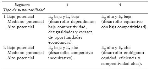 Las regiones con más desventajas son las que combinan los tipos 13 con una sustentabilidad de bajo potencial, pues son regiones con alta dependencia, desigualdades internas, con debilidades (pobreza y/o marginación) y con un deterioro de su contexto espaciotemporal natural. También lo son las regiones del tipo 2 y 4 que manifiestan una sustentabilidad de bajo potencial, pues revelan una alta vulnerabilidad. Las regiones con más ventajas son las que combinan los tipos 24 con alto potencial de sustentabilidad, pues poseen menos desigualdades internas, dependen más de sus fortalezas y oportunidades endógenas y presentan alternativas de su contexto espaciotemporal natural que garantiza el desarrollo a largo plazo. Los tipos de región 14 y 23 con posibilidades de mediano y alto potencial de sustentabilidad se ubican en un punto intermedio. La clasificación anterior se puede visualizar en una matriz como la que se indica a continuación.